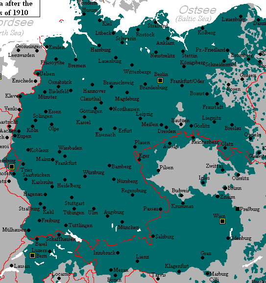 Duits taalgebied, 1910Dat is inderdaad aan het Tsjechisch te merken. En niet eens zozeer aan rechtstreekse Duitse ontleningen, al zijn die er ook: taška ‘zak’, bijvoorbeeld, komt van Tasche. Het is meer de manier waarop allerlei ‘inheemse’ woorden gevormd of gebruikt worden die het langdurige samenwonen verraadt.
