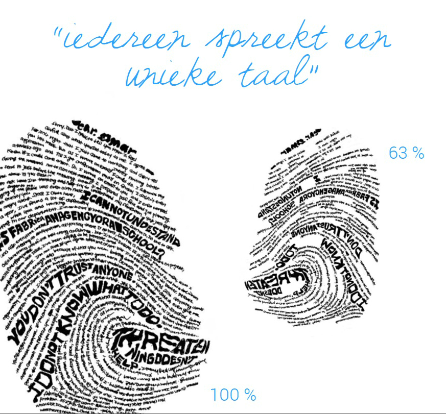 Waar Strik praktische applicaties ontwikkelt voor mensen die die nú willen gebruiken, daar is Eke Rebergen, als multimediaal ontwerper en docent aan Avans Hogeschool in Den Bosch, vooral bezig met de software van de toekomst en de beleving van de gebruiker. Op verzoek van het Taalmuseum heeft hij zijn studenten apps op taalgebied laten ontwerpen, en twee van hen kwamen hun idee presenteren. Floor Rooijakkers bedacht een sociale netwerkapp die het kenmerkende taalgebruik van de gebruikers zichtbaar maakt: woorden die ze opvallend vaak gebruiken verschijnen in beeld in de vorm van een vingerafdruk (zie afbeelding hierboven). Sifra van Dalen ontwierp een sociale game die de deelnemers ervan bewust maakt dat een goede interpunctie hun teksten begrijpelijker maakt.