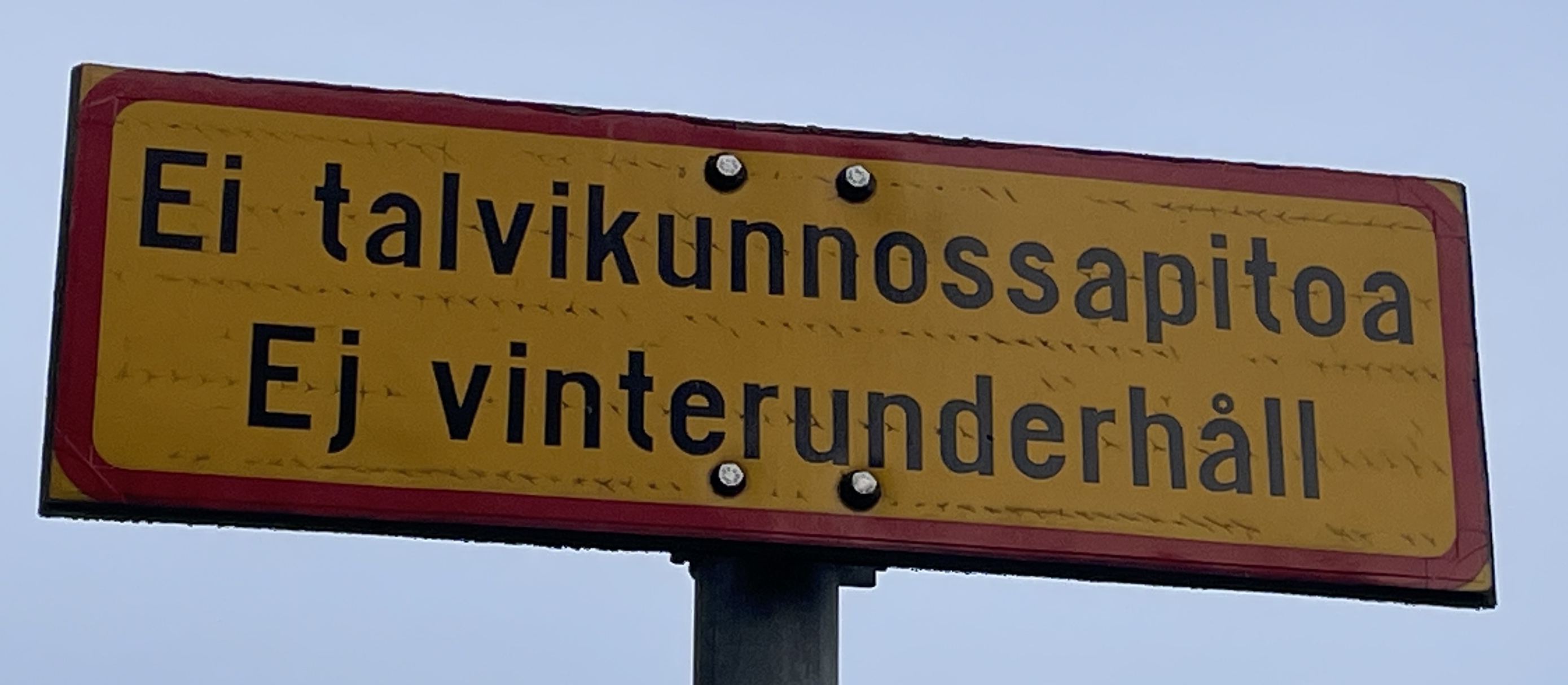 Het Finse ei en het Zweedse ej zijn allebei ontkenningen: ‘niet, geen’ – de gelijkenis schijnt toeval te zijn. Belangrijker: wát is er niet? VinterunderhĂĄll, ‘winteronderhoud’ dus. Dat betekent ‘strooien’, neem ik aan. Of zouden ze ook straatverwarming en gratis koek en zopie bedoelen? Finland is tenslotte een van de rijkste landen ter wereld.