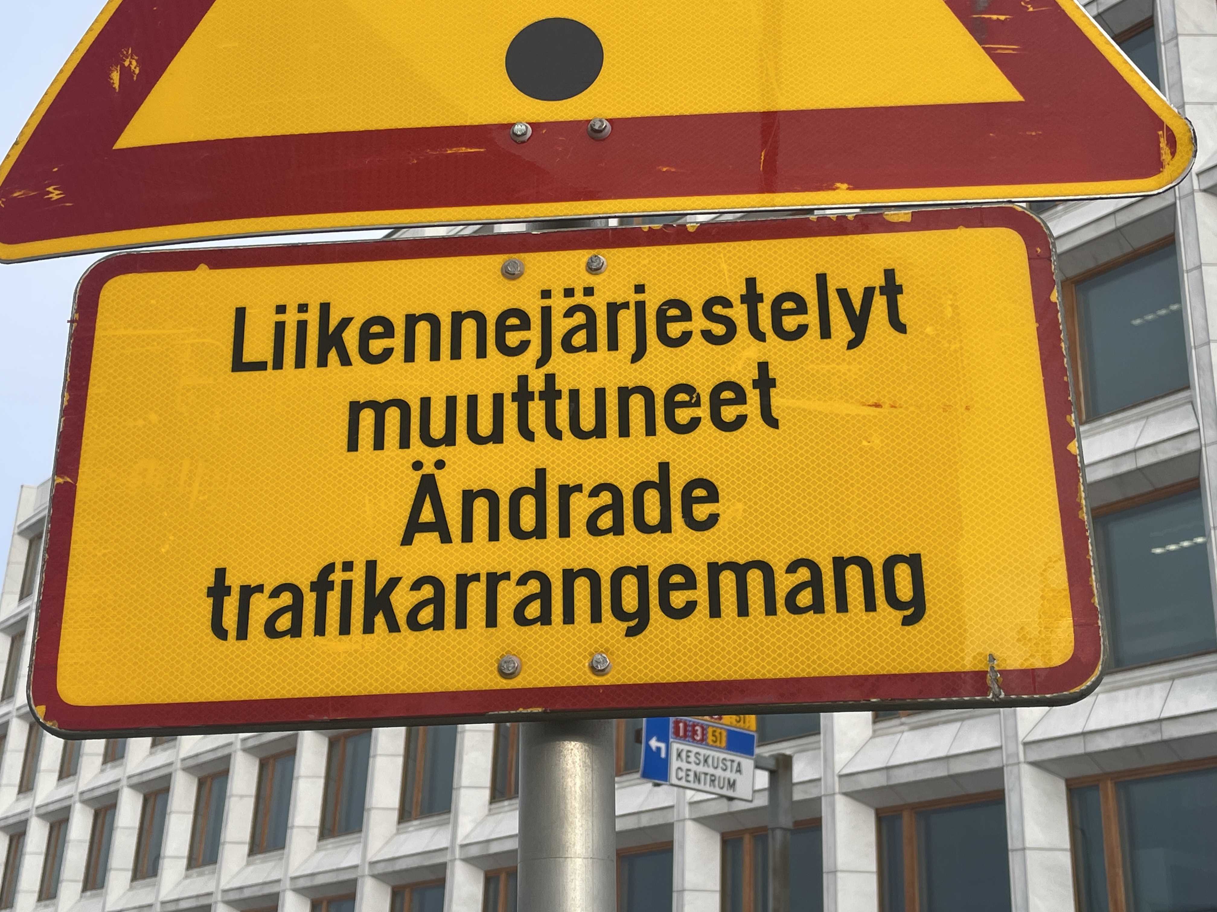 De bovenste twee regels zeggen me weer helemaal niks. Maar in de onderste twee, de Zweedse dus, herken ik het Duitse geänderte (‘veranderde’), het Engelse traffic (verkeer) en het Franse arrangement – ‘gewijzigde verkeerssituatie’ dus. Niet dat ik daar in de praktijk iets aan had, want als nieuwkomer wist ik niet hoe de oude situatie was. Maar hĂ©, ik weet nu in ieder geval dat er niet wordt gewaarschuwd voor gladheid, vetfietsen of het schrikbarend lelijke gebouw op de achtergond.
