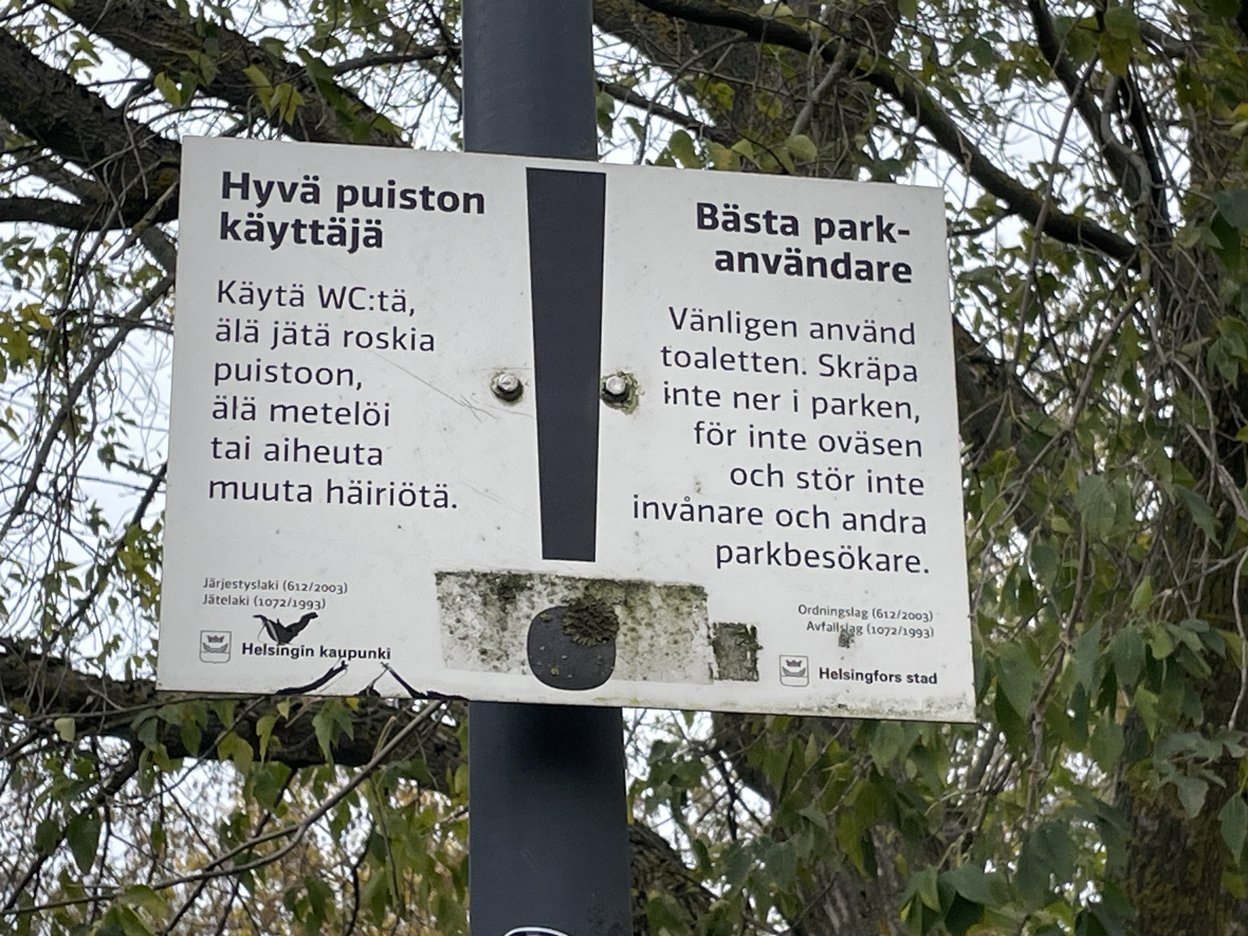 ‘Beste park-aanwenders.’ Vänligen is ‘vriendelijk’, dat ken ik. Använd toaletten: ‘wend het toilet aan’. Oftewel: geen wildplasserij. Skräpa inte ner i parken: geen ‘neer-skräpen’ in het park – op de grond gooien misschien, van Engelse scraps bijvoorbeeld? (Klopt, al weet ik niet of de Engelse associatie etymologisch hout snijdt.) För inte oväsen: voeder niet de oväs – vast een of ander dier. Stör inte invĂĄnare och andre parkbesökare – ‘stoor niet inwoners en andere parkbezoekers.’