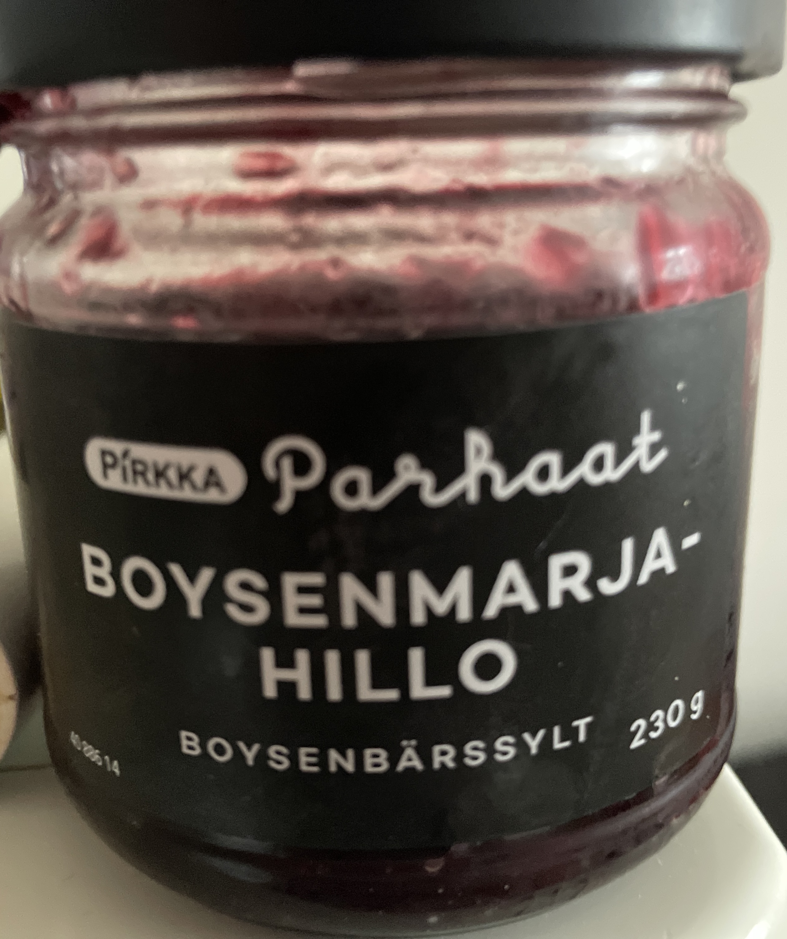 En wat zit er in dit potje precies? Boysenmarjahillo. O… kee. En in het Zweeds? Boysenbärssylt. Hm. Bär, dat moet ‘bes’ zijn – denk aan de Duitse Beeren, zoals Erd-, Him– en Preiselbeere. De laatste lettergreep, sylt, doet denken aan ‘zult’, maar dat zal toeval zijn, tenzij ze allebei zoiets als ‘stevige prut, substantie’ betekenen. Maar boysen? Geen idee. Als ik het later opzoek, blijkt dat aan mijn onwetendheid te liggen: de Nederlandse naam is boysenbes, genoemd naar een Amerikaanse veredelaar, Rudy Boysen. (En verhip, sylt en zult komen allebei van een oud woord voor ‘zilt water’. Tsss. HMNGW. De jam smaakt trouwens wel degelijk zoet, niet zout. Er zit dan ook sokeri/socker in.)